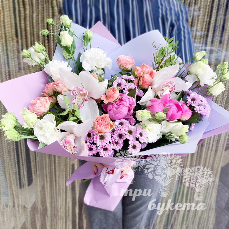 - Внимание! В букете используются сезонные цветы, наличие уточняйте по телефону.