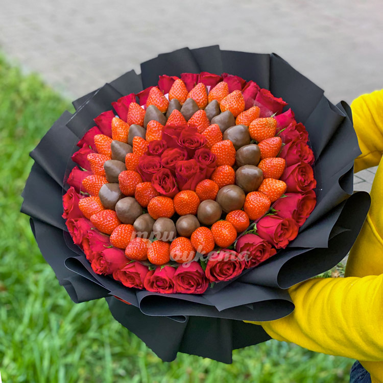 Букет из красных роз и клубники