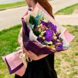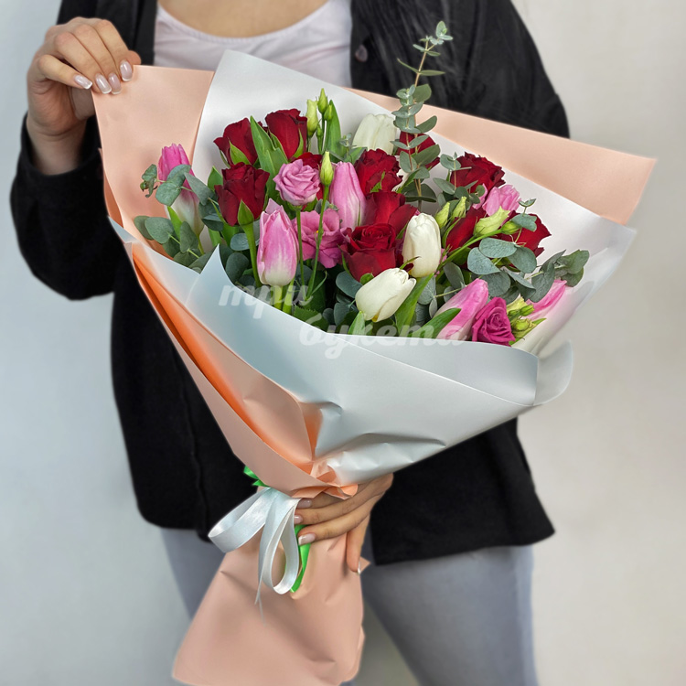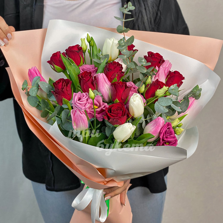 Букет из роз, тюльпанов и эвкалипта