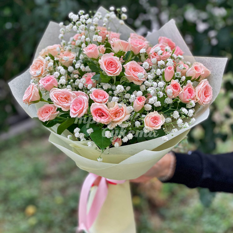 Букет кустовых роз с гипсофилой