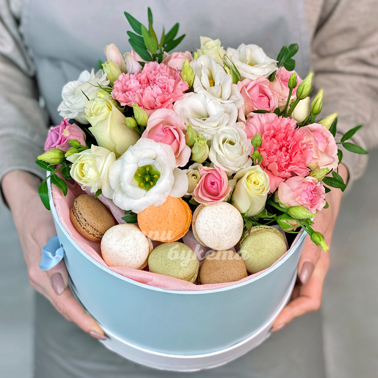 Эустомы и макаруны в коробке