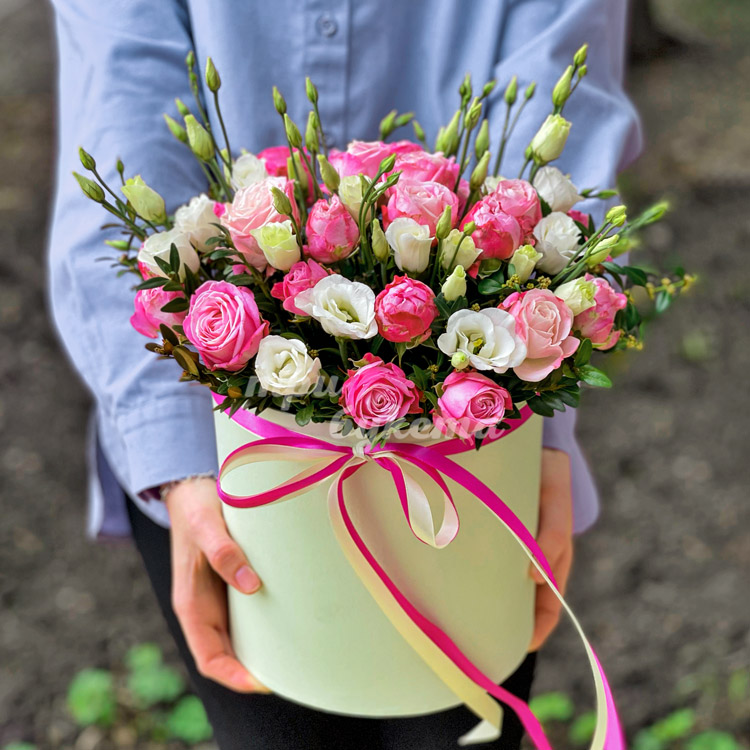 Коробка розовых роз и белых эустом