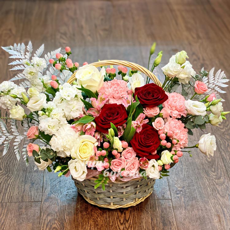 Корзина из гвоздик, роз и маттиол