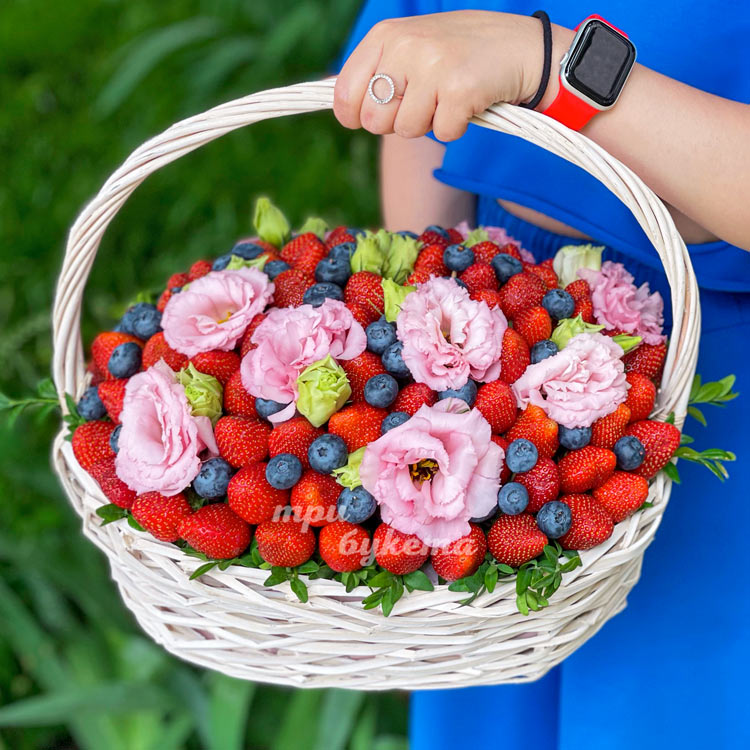 Корзина с розовыми эустомами и ягодами